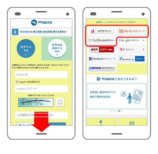 2. mopitaログインポータルに移動します。ログイン画面の下部で入会時に利用したログイン方法を選択するとmopitaへのログインが完了します。 (別途パスワードの入力が必要になる場合があります)