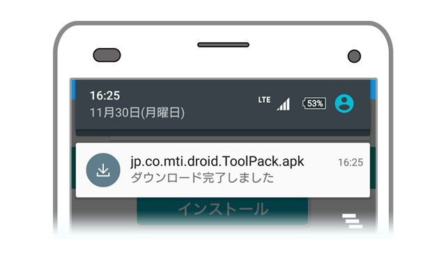 2. ダウンロードが完了したら、画面上部にある通知バーをスライドしてください。『jp.co.mti.droid.ToolPack.apk』という表示がありますので、これをタップすると、アプリがインストールされます。